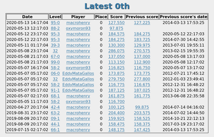 Thanks for doing that. Would it be possible to see, say, the last 10 0ths to be taken (including dates)? I'm just curious. I'd also be interested in seeing some kind of chart (similar to Hendor and Seifer's) that tracks highscore activity over time. (how many new 0ths in a given day, week, and month, etc.)